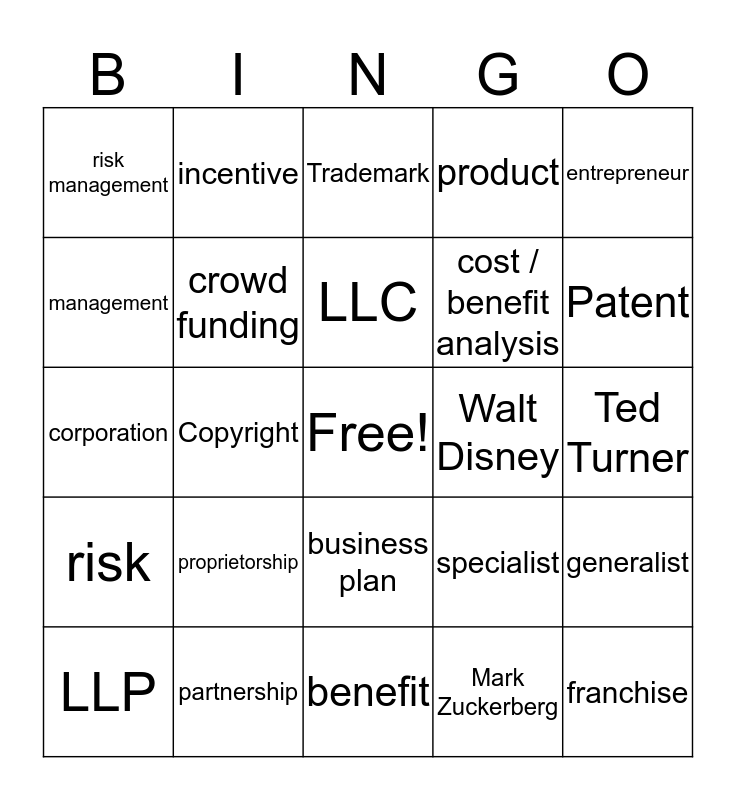 This bingo card has a free space and 24 words: proprietorship, partnership, LLC, LLP, entrepreneur, risk management, management, incentive, Walt Disney, business plan, cost / benefit analysis, corporation, specialist, generalist, crowd funding, Mark Zuckerberg, Ted Turner, Trademark, Patent, Copyright, franchise, risk, product and benefit.