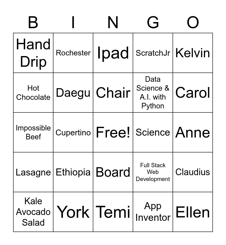This bingo card has a free space and 49 words: Latte, Jakarta, Laptop, App Inventor, Anne, Lemon and Thyme Soda, Rochester, Mouse, Data Science & A.I. with Python, Han, Hot Chocolate, Cupertino, Full Stack Web Development, Ellen, Macchiato, Utah, Ipad, Science, Kyross, Hand Drip, York, Temi, ScratchJr, Kelvin, Genmaicha, Ethiopia, Chair, Scratch, Claudius, Lasagne, Zurich, Board, Roblox, Koey, Kale Avocado Salad, Illinois, Zoom, Minecraft, Carol, Lemon Tart, Georgia, Google Meet, Unity, Connie, Impossible Beef, Daegu, TV, Spark AR and Carmen.