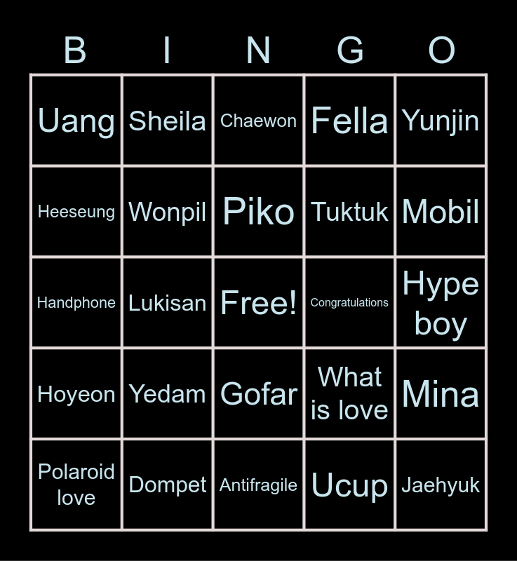 This bingo card has a free space and 24 words: Yedam, Dompet, Piko, Polaroid love, Yunjin, Uang, Heeseung, Sheila, Congratulations, Gofar, Tuktuk, Handphone, What is love, Mina, Wonpil, Ucup, Hype boy, Chaewon, Mobil, Lukisan, Jaehyuk, Hoyeon, Fella and Antifragile.