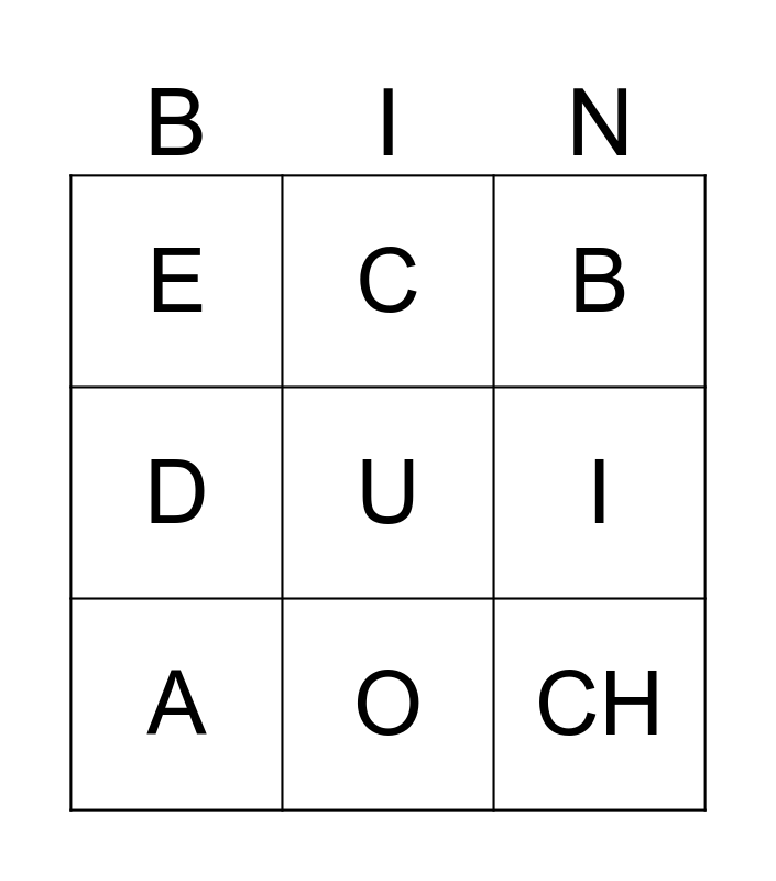 This bingo card has 9 words: A, B, C, D, E, I, U, CH and O.