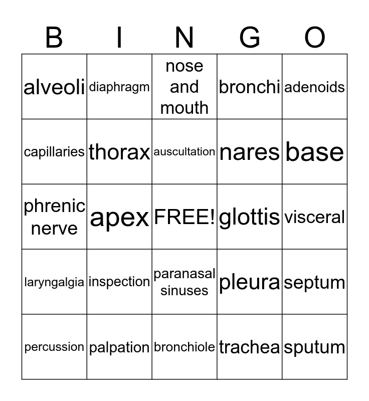 This bingo card has a free space and 24 words: inspection, palpation, auscultation, percussion, adenoids, alveoli, capillaries, diaphragm, glottis, paranasal sinuses, nares, phrenic nerve, pleura, septum, thorax, trachea, visceral, nose and mouth, base, apex, sputum, laryngalgia, bronchi and bronchiole.