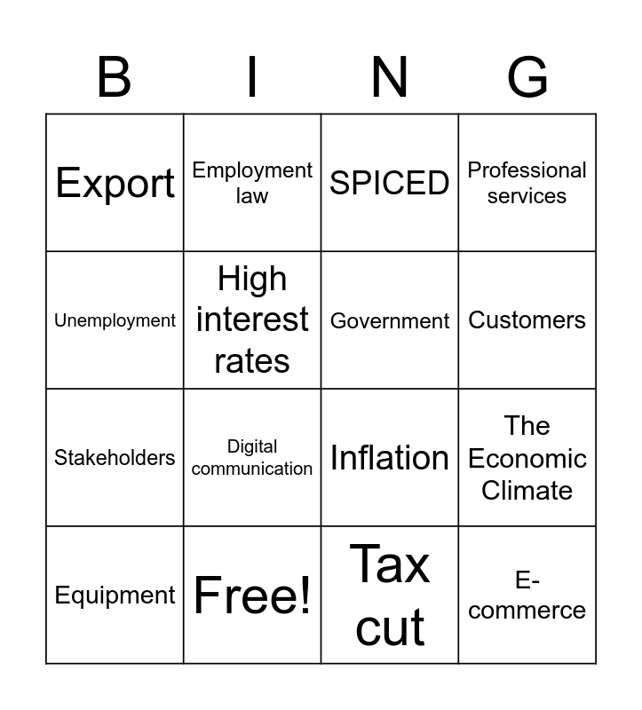 This bingo card has 16 words: Free!, The Economic Climate, SPICED, Export, Stakeholders, Employment law, Inflation, Tax cut, Unemployment, High interest rates, Equipment, Professional services, Digital communication, Customers, Government and E-commerce.