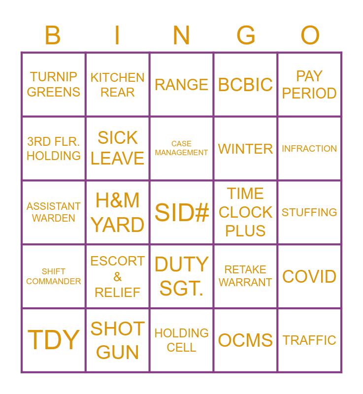 This bingo card has 100 words: Free!, TURKEY, STUFFING, CRANBERRY SAUCE, HAM, COLLARD GREEN, SWEET POTATO PIE, CANDIED YAMS, FORREST ST, MASTER CONTROL, DELTA BLOCK, COMPOUND, FLEX CUFFS, SHOT GUN, PERSONAL LEAVE, HOLIDAYS, WINTER, SNOW, SNOWMAN, LEG IRONS, KWANZAA, PROJECTIONS, I.D. CARD, METHADONE, LOWER LEVEL, TIME CLOCK PLUS, PAY PERIOD, RETAKE WARRANT, DETAINER, INTAKE, H&M YARD, TURNIP GREENS, RIBS, COURT, OCMS, CASE MANAGEMENT, COVID, RELEASE, TEMPERATURES, TRAFFIC, LOWER WAGON YARD, WARDEN, ASSISTANT WARDEN, CHIEF OF SECURITY, INFRACTION, RANGE, IN-SERVICE TRAINING, EOC DRILLS, FIRE DRILLS, HOLDING CELL, SEGREGATION, ADMIN SEG, CLASSIFICATION, MAJOR, LIEUTENANT, CO I, CO II, SGT, MRDCC, BCBIC, YDC, CDF, BCCC, MTC, RECREATION, CIT, RADIO, HMF, POST 201, POST 5, EAGER ST, ESCORT & RELIEF, LOWER ROVER, UPPER ROVER, O.I.C., UTILITY, ROTUNDA, 3RD FLR. HOLDING, SANITATION, ESSENTIAL EMPLOYEE, DELTA BLK LOBBY, SID#, TRANSPORTATION, DUTY SGT., KITCHEN, KITCHEN REAR, INMATE WATCH, TIMEKEEPER, HOSP. SANITATION, SHIFT COMMANDER, LEAVE SLIP, ANNUAL LEAVE, COMP TIME, TDY, SICK LEAVE, XMAS TREE, BISCUTS, TABLETS, PAWS and CAPTAIN.