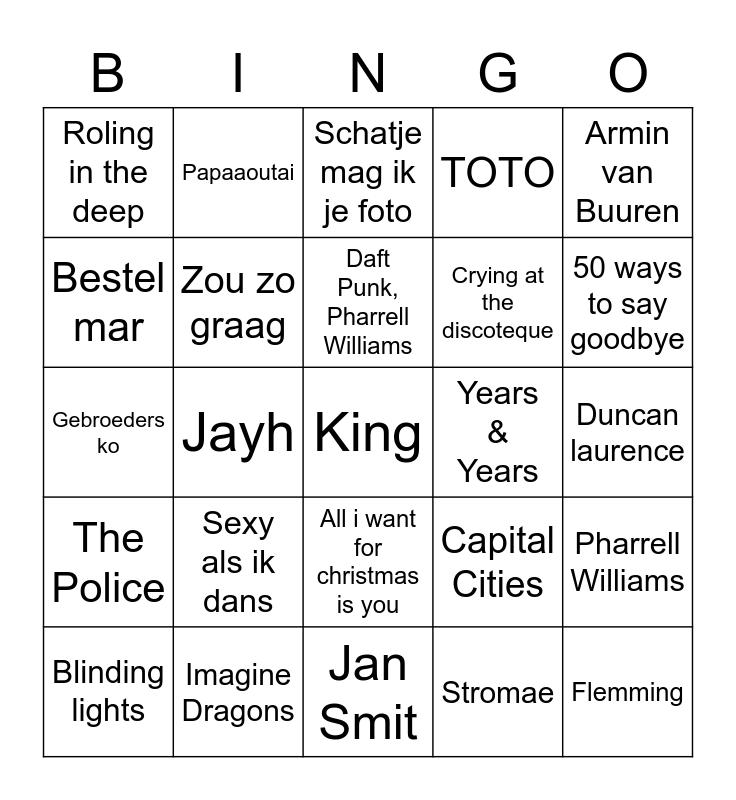 This bingo card has 120 words: Free!, This is what it feels like, All Summer Long, Men at work, No doubt, Train, TOTO, Luis Fonsi, Daddy Yankee, Pharrell Williams, Phil Collins, Vinzzent, UB40, Urbanus, Het goede doel, Dire Straits, Elvis Presley, All i want for christmas is you, Amsterdam, Anton aus tirol, Hypnotized, Blinding lights, Schatje mag ik je foto, Around the world, Oerend hard, Matthias Reim, The Police, Imagine Dragons, Earth, Wind & fire, Upside down, Dan Hartman, Stromae, Jayh, Daft Punk, Pharrell Williams, Chef'special, Andrea Berg, Guus Meewis, Rowwen Hèze, Kingston town, Madame met een bontjas, Belgie (is er leven op pluto), Money for nothing, Jailhouse rock, De Dijk, Rihanna, Survivor, Alcazar, Gipsy Kings, Years & Years, Nielson, Adelle, Spandau Ballet, Wham!, Capital Cities, Verdammt, ich lieb dich, Message in a bottle, On top of the world, Boogie wondeland, Diana Ross, Relight my fire, Papaaoutai, Mooie dag, Get Lucky, Afraid of the dark, Du hast mich tausendmal belogen, Per spoor (kedeng kedeng), Bestel mar, Mariah carey, Flemming, Purple disco machine, The weeknd, Gebroeders ko, A touch of class, Normaal, Ik kan het niet alleen, Diamonds, Eye of the tiger, Crying at the discoteque, Bamboléo, King, Sexy als ik dans, Roling in the deep, Gold, Wake me up before you go-go, Safe and sound, Ava Max, Genesis, Jan Smit, Taylor Swift, The killers, Camila Cavello, Ed Sheeran, Jurk, Duncan laurence, Toploader, Sheppard, Maroon 5, Shakira, The Scene, Armin van Buuren, Rid Rock, Sweet but psycho, Jesus he knows me, Dan volg je haar benen, Shake it of, Human, Bam Bam, Zou zo graag, Arcade, Dancing in de the moonlight, Coming home, Sugar, Hips don't lie, Iedreeen is van de wereld, Down under, Dont'speak, 50 ways to say goodbye, Rosanna, Despacito, Happy, Another day in paradise and Dromendas.