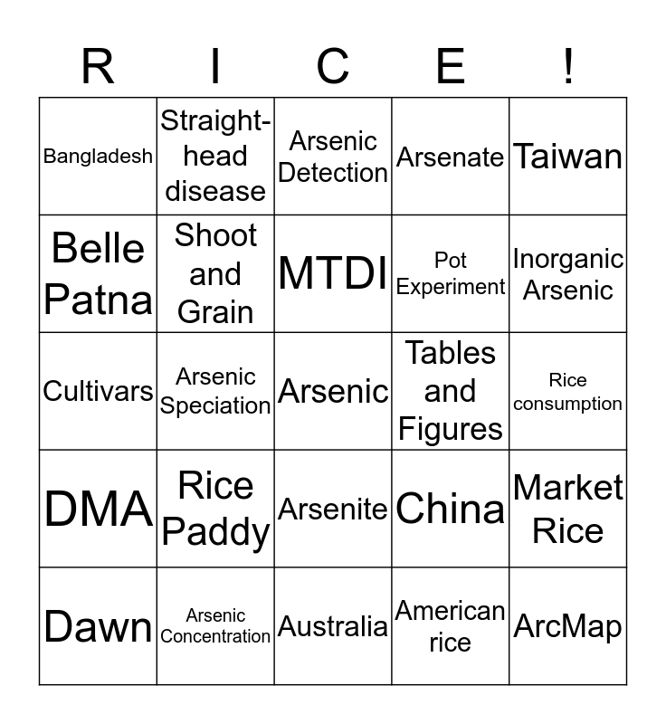 This bingo card has a free space and 24 words: Rice Paddy, Arsenic Concentration, MTDI, Dawn, Taiwan, Bangladesh, Belle Patna, Straight-head disease, Tables and Figures, Arsenite, Pot Experiment, Cultivars, China, Market Rice, Shoot and Grain, American rice, Rice consumption, Arsenic Detection, Inorganic Arsenic, Arsenic Speciation, ArcMap, DMA, Arsenate and Australia.
