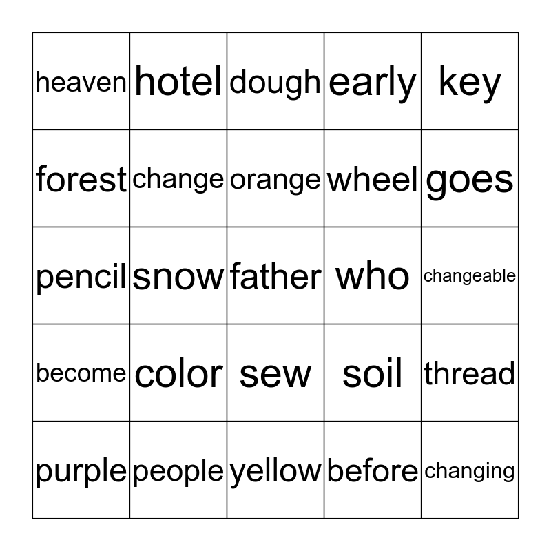 This bingo card has 25 words: color, yellow, orange, purple, key, heaven, forest, hotel, who, sew, wheel, pencil, soil, thread, change, changing, changeable, dough, goes, snow, father, people, become, early and before.