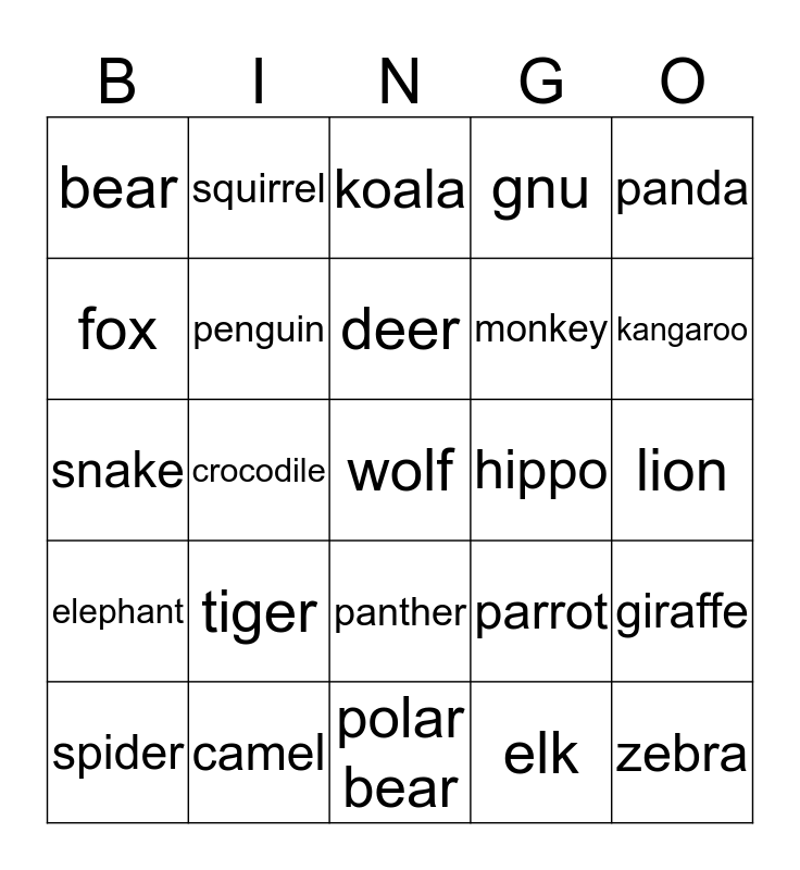 This bingo card has 25 words: tiger, polar bear, deer, spider, panda, bear, fox, squirrel, hippo, panther, monkey, snake, parrot, giraffe, penguin, zebra, lion, koala, kangaroo, crocodile, wolf, camel, elephant, gnu and elk.