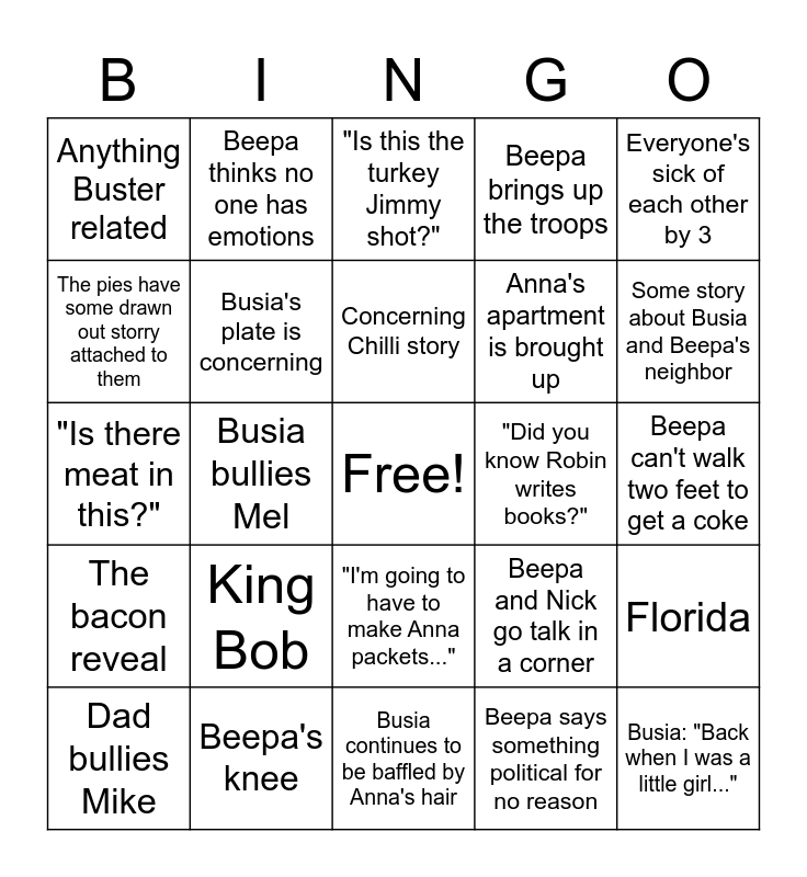 This bingo card has a free space and 24 words: King Bob, Beepa's knee, Concerning Chilli story, Dad bullies Mike, Everyone's sick of each other by 3, Anything Buster related, The pies have some drawn out storry attached to them, Beepa thinks no one has emotions, "Did you know Robin writes books?", "I'm going to have to make Anna packets...", Anna's apartment is brought up, "Is there meat in this?", Beepa and Nick go talk in a corner, Florida, Busia's plate is concerning, Beepa says something political for no reason, Beepa can't walk two feet to get a coke, "Is this the turkey Jimmy shot?", Some story about Busia and Beepa's neighbor, Busia bullies Mel, Busia: "Back when I was a little girl...", The bacon reveal, Beepa brings up the troops and Busia continues to be baffled by Anna's hair.