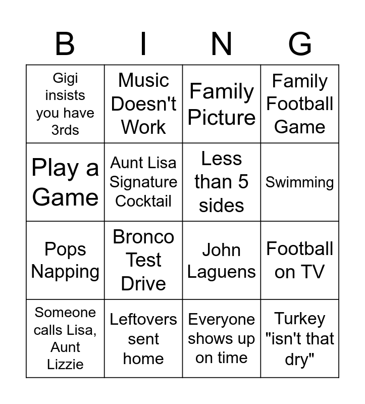 This bingo card has 1 images and 19 words: Football on TV, Kids Table, Family Picture, More than 4 apps, Someone calls Lisa, Aunt Lizzie, Play a Game, Leftovers sent home, Gigi insists you have 3rds, Pops Napping, Music Doesn't Work, Bronco Test Drive, John Laguens, Aunt Lisa Signature Cocktail, Turkey "isn't that dry", Less than 5 sides, Swimming, Family Football Game, Everyone shows up on time and Fireplace with Doors Open.