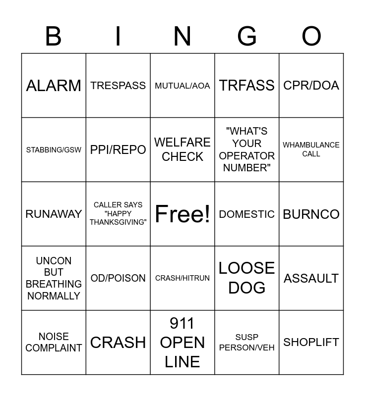 This bingo card has a free space and 24 words: OD/POISON, CRASH, WELFARE CHECK, NOISE COMPLAINT, CPR/DOA, ALARM, STABBING/GSW, TRESPASS, DOMESTIC, CRASH/HITRUN, "WHAT'S YOUR OPERATOR NUMBER", RUNAWAY, LOOSE DOG, ASSAULT, PPI/REPO, SUSP PERSON/VEH, BURNCO, MUTUAL/AOA, WHAMBULANCE CALL, CALLER SAYS "HAPPY THANKSGIVING", SHOPLIFT, UNCON BUT BREATHING NORMALLY, TRFASS and 911 OPEN LINE.