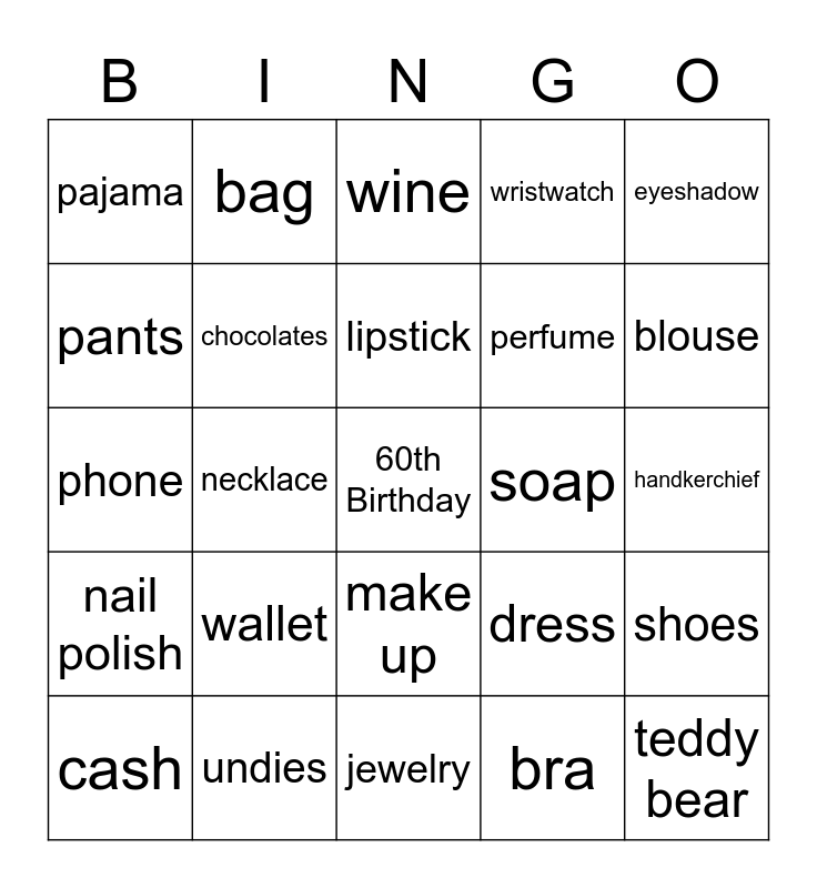 This bingo card has a free space and 24 words: wallet, undies, lipstick, cash, eyeshadow, pajama, pants, bag, soap, make up, perfume, phone, dress, shoes, chocolates, bra, handkerchief, wine, blouse, necklace, teddy bear, nail polish, wristwatch and jewelry.