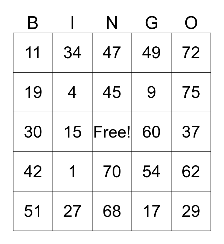 This bingo card has a free space and 24 words: 1, 27, 45, 51, 72, 11, 19, 34, 60, 70, 9, 30, 54, 62, 4, 17, 37, 47, 75, 15, 29, 42, 49 and 68.