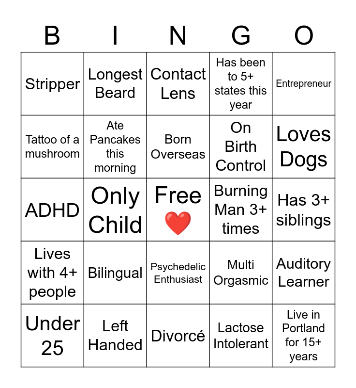 This bingo card has a free space and 24 words: Bilingual, Left Handed, Born Overseas, Under 25, Entrepreneur, Stripper, Tattoo of a mushroom, Longest Beard, Burning Man 3+ times, Psychedelic Enthusiast, On Birth Control, ADHD, Multi Orgasmic, Auditory Learner, Ate Pancakes this morning, Lactose Intolerant, Has 3+ siblings, Contact Lens, Loves Dogs, Only Child, Live in Portland for 15+ years, Lives with 4+ people, Has been to 5+ states this year and DivorcΓ©.