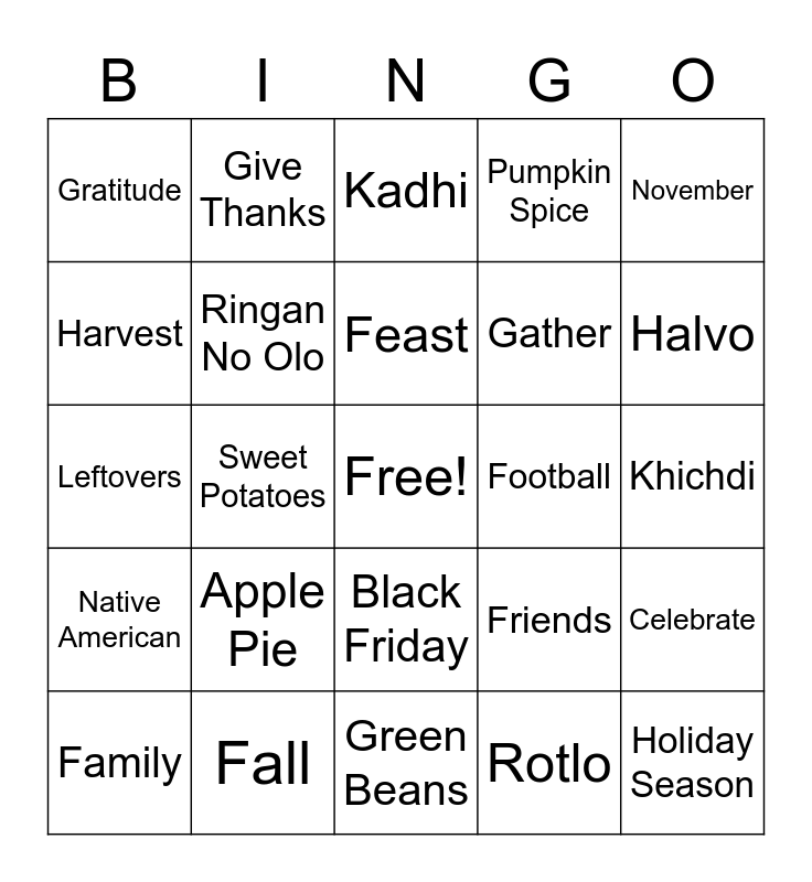 This bingo card has a free space and 24 words: Apple Pie, Fall, Feast, Family, November, Gratitude, Harvest, Give Thanks, Football, Black Friday, Gather, Leftovers, Friends, Celebrate, Ringan No Olo, Rotlo, Khichdi, Kadhi, Halvo, Sweet Potatoes, Holiday Season, Native American, Pumpkin Spice and Green Beans.