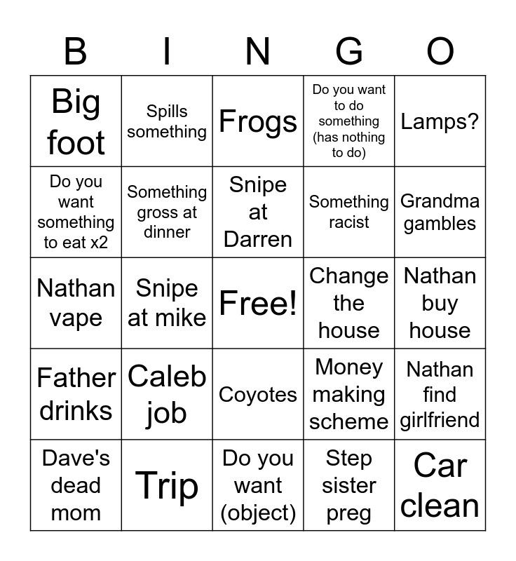 This bingo card has a free space and 24 words: Dave's dead mom, Caleb job, Snipe at Darren, Step sister preg, Lamps?, Big foot, Spills something, Frogs, Change the house, Nathan buy house, Nathan vape, Something gross at dinner, Money making scheme, Nathan find girlfriend, Do you want something to eat x2, Trip, Do you want (object), Do you want to do something (has nothing to do), Grandma gambles, Father drinks, Snipe at mike, Coyotes, Something racist and Car clean.