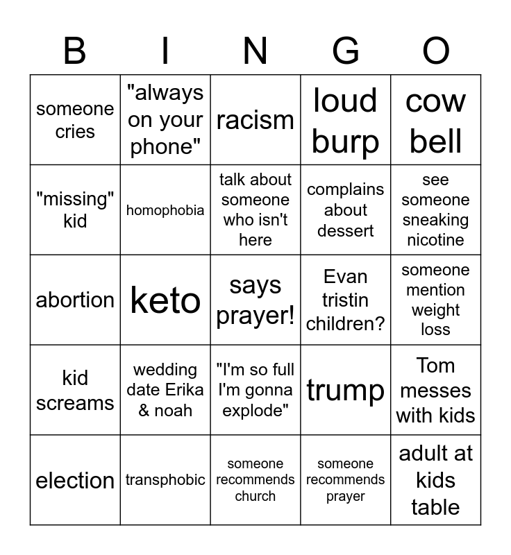 This bingo card has a free space and 29 words: election, gas prices, keto, kid get too rowdy, someone cries, racism, homophobia, wedding date Erika & noah, Evan tristin children?, transphobic, someone mention weight loss, adult at kids table, someone recommends church, someone recommends prayer, see someone sneaking nicotine, someone farts, "I'm so full I'm gonna explode", kid screams, cow bell, abortion, trump, football on tv, complains about dessert, "missing" kid, loud burp, "always on your phone", Tom messes with kids, talk about someone who isn't here and asks about college.