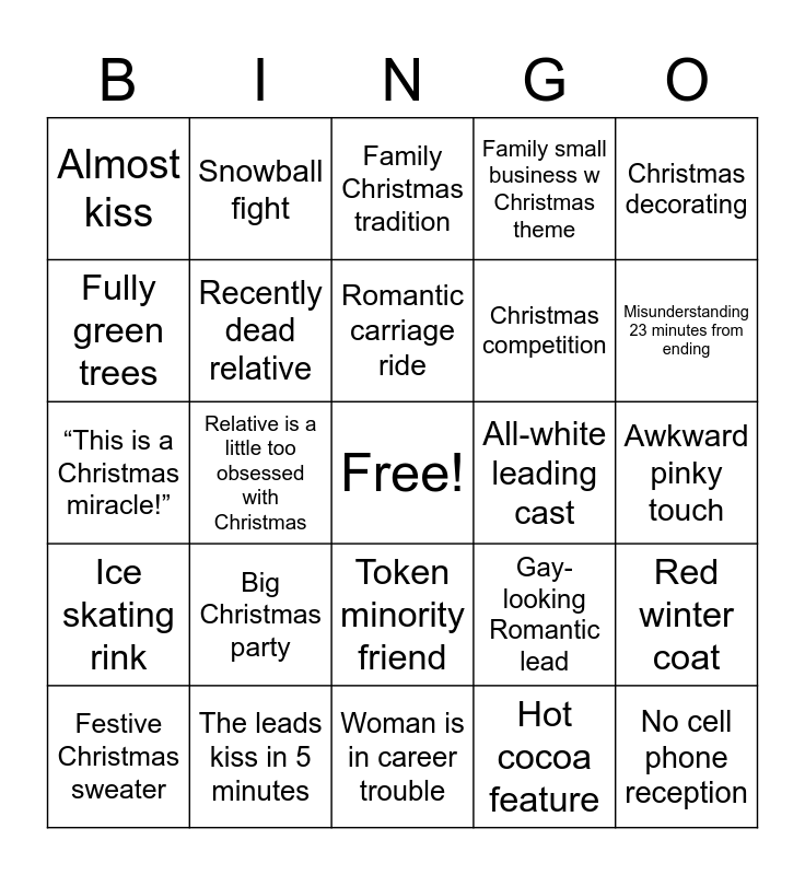 This bingo card has a free space and 27 words: Gay-looking Romantic lead, Big city girl goes to small town, Christmas competition, Woman is in career trouble, Fully green trees, Family Christmas tradition, Snowball fight, Ice skating rink, All-white leading cast, Red winter coat, “This is a Christmas miracle!”, Family small business w Christmas theme, Festive Christmas sweater, The leads kiss in 5 minutes, Misunderstanding 23 minutes from ending, “Grandma’s Secret recipe”, Recently dead relative, Romantic carriage ride, Big Christmas party, Almost kiss, Awkward pinky touch, Hot cocoa feature, Relative is a little too obsessed with Christmas, No cell phone reception, Token minority friend, Christmas decorating and Town-wide Christmas tradition.