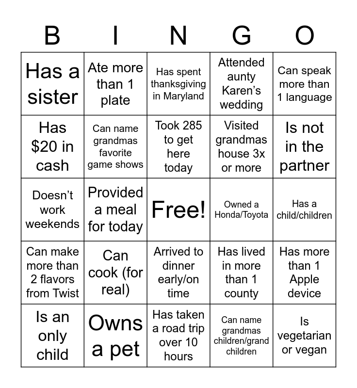 This bingo card has a free space and 24 words: Is an only child, Can cook (for real), Took 285 to get here today, Can name grandmas children/grand children, Can speak more than 1 language, Has a sister, Ate more than 1 plate, Has spent thanksgiving in Maryland, Owned a Honda/Toyota, Has a child/children, Doesn’t work weekends, Can name grandmas favorite game shows, Has lived in more than 1 county, Has more than 1 Apple device, Has $20 in cash, Owns a pet, Has taken a road trip over 10 hours, Attended aunty Karen’s wedding, Is not in the partner, Can make more than 2 flavors from Twist, Provided a meal for today, Arrived to dinner early/on time, Visited grandmas house 3x or more and Is vegetarian or vegan.