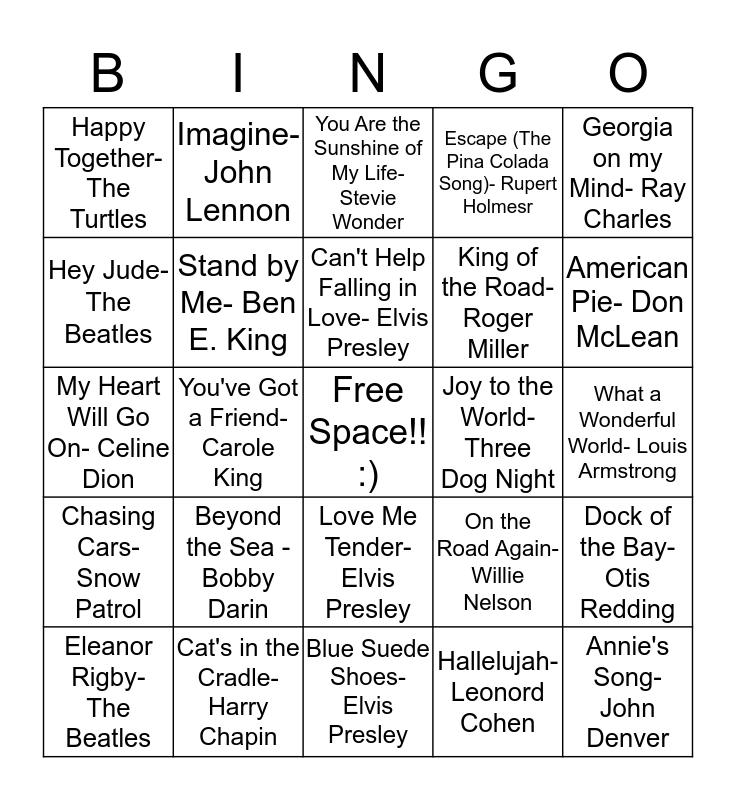 This bingo card has a free space and 25 words: Beyond the Sea - Bobby Darin, Blue Suede Shoes- Elvis Presley, Can't Help Falling in Love- Elvis Presley, Eleanor Rigby- The Beatles, Georgia on my Mind- Ray Charles, Happy Together- The Turtles, Hey Jude- The Beatles, Imagine- John Lennon, Joy to the World- Three Dog Night, Love Me Tender- Elvis Presley, King of the Road- Roger Miller, My Heart Will Go On- Celine Dion, On the Road Again- Willie Nelson, Dock of the Bay- Otis Redding, Stand by Me- Ben E. King, Time in a Bottle- Jim Croce, What a Wonderful World- Louis Armstrong, You Are the Sunshine of My Life- Stevie Wonder, American Pie- Don McLean, You've Got a Friend- Carole King, Annie's Song- John Denver, Cat's in the Cradle- Harry Chapin, Chasing Cars- Snow Patrol, Escape (The Pina Colada Song)- Rupert Holmesr and Hallelujah- Leonord Cohen.