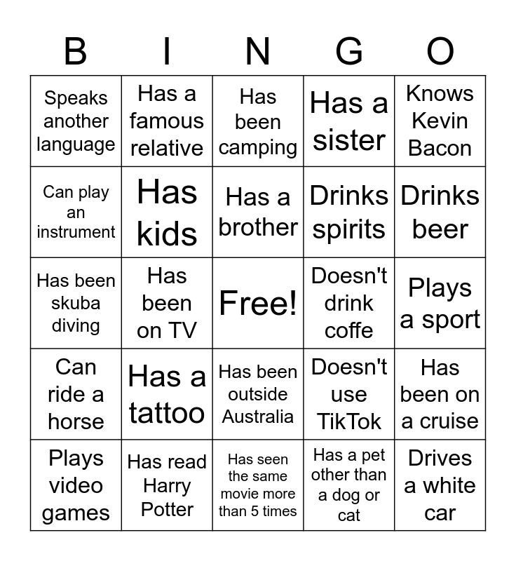 This bingo card has a free space and 24 words: Has a tattoo, Has read Harry Potter, Has a brother, Plays video games, Knows Kevin Bacon, Speaks another language, Can play an instrument, Has a famous relative, Doesn't drink coffe, Has been outside Australia, Drinks spirits, Has been skuba diving, Doesn't use TikTok, Has been on a cruise, Has kids, Has a pet other than a dog or cat, Plays a sport, Has been camping, Drinks beer, Has been on TV, Drives a white car, Can ride a horse, Has a sister and Has seen the same movie more than 5 times.