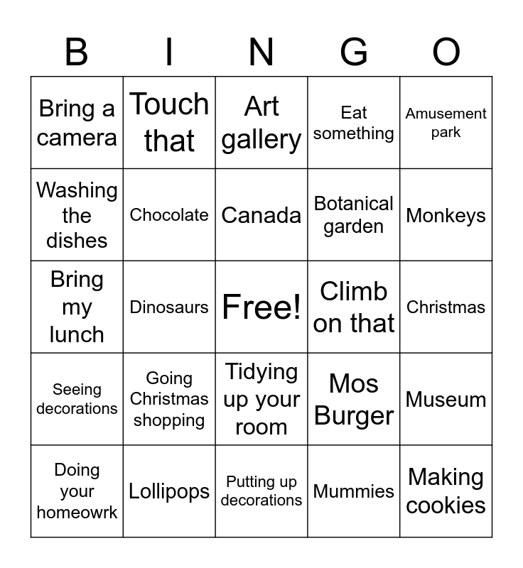 This bingo card has a free space and 29 words: Doing your homeowrk, Eating cookies, Dinosaurs, Sushi, Bring a camera, Art gallery, Chocolate, Going Christmas shopping, Climb on that, Lollipops, Christmas, Making cookies, Putting up decorations, Mummies, Monkeys, Drink something, Tidying up your room, Seeing decorations, Amusement park, Bring my lunch, Mos Burger, Tokyo, Botanical garden, Washing the dishes, Eat something, Touch that, Museum, Canada and Lock the door.