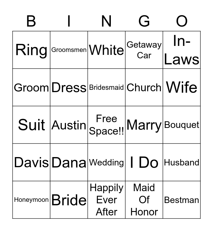 This bingo card has a free space and 24 words: Dana, Bride, Bridesmaid, Honeymoon, In-Laws, Ring, Groom, Groomsmen, Marry, Wedding, Church, Suit, I Do, Husband, Dress, Maid Of Honor, Bouquet, White, Wife, Austin, Bestman, Davis, Getaway Car and Happily Ever After.