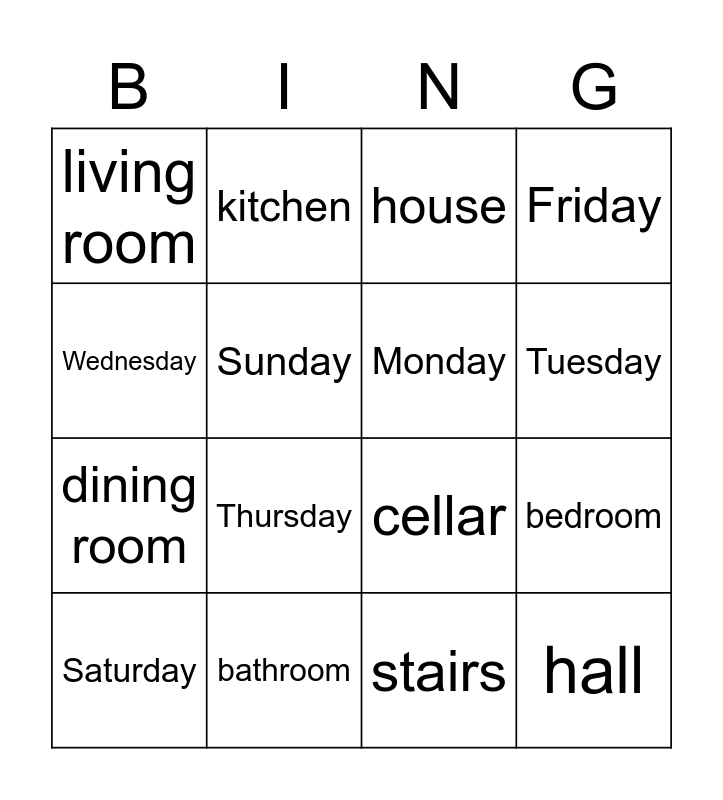 This bingo card has 16 words: bathroom, bedroom, house, living room, dining room, kitchen, cellar, stairs, Wednesday, Sunday, Saturday, Friday, Thursday, Tuesday, Monday and hall.