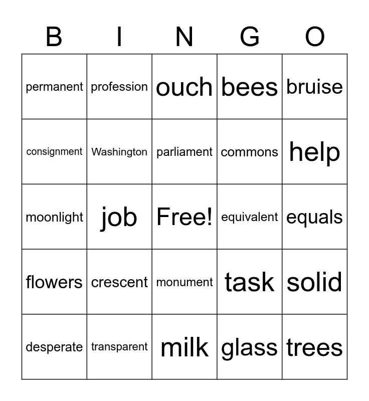 This bingo card has a free space and 24 words: crescent, transparent, parliament, desperate, bruise, permanent, consignment, profession, equivalent, monument, commons, moonlight, task, solid, Washington, glass, equals, ouch, help, job, trees, flowers, bees and milk.