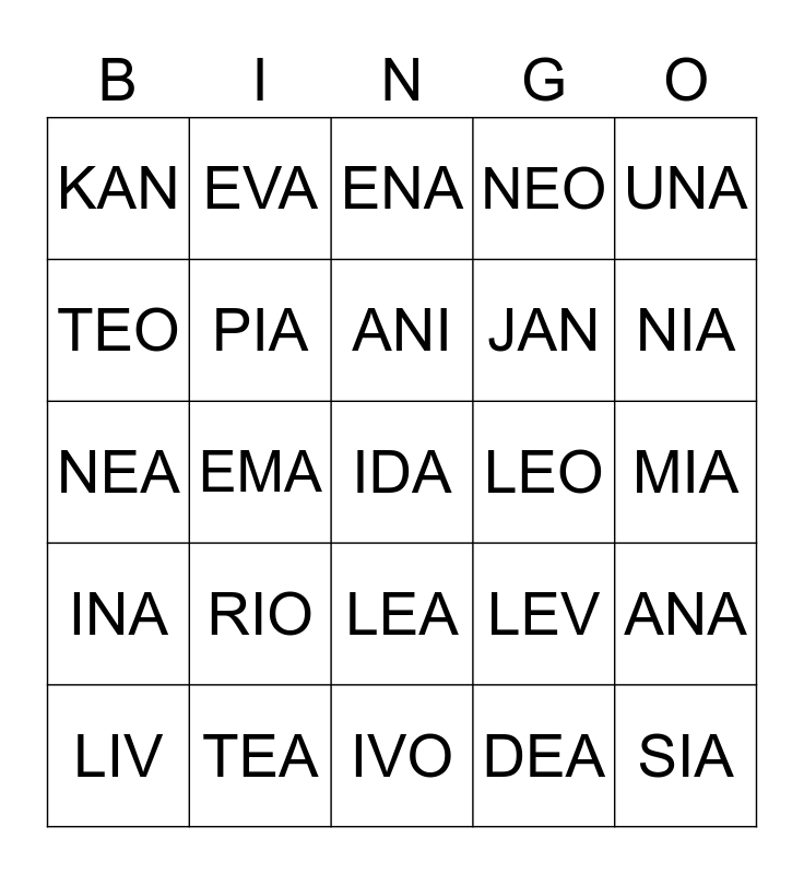 This bingo card has 25 words: RIO, IVO, ANI, LIV, UNA, KAN, TEO, EVA, LEO, LEA, JAN, NEA, LEV, ANA, PIA, SIA, MIA, ENA, NIA, EMA, IDA, TEA, INA, NEO and DEA.