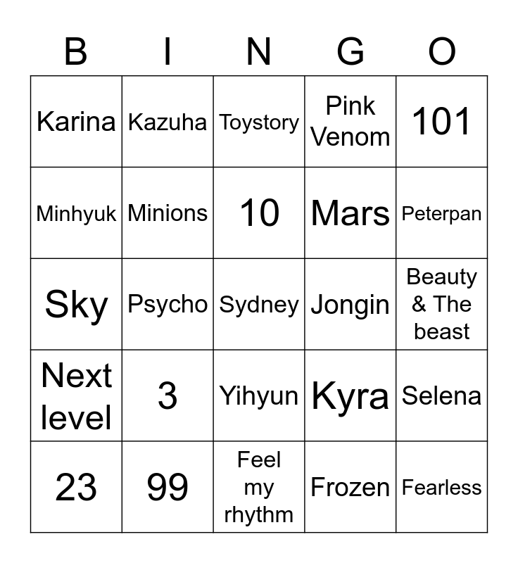 This bingo card has a free space and 24 words: 3, 99, 10, 23, 101, Karina, Minhyuk, Kazuha, Jongin, Yihyun, Mars, Sky, Kyra, Selena, Minions, Frozen, Beauty & The beast, Toystory, Peterpan, Psycho, Fearless, Next level, Pink Venom and Feel my rhythm.