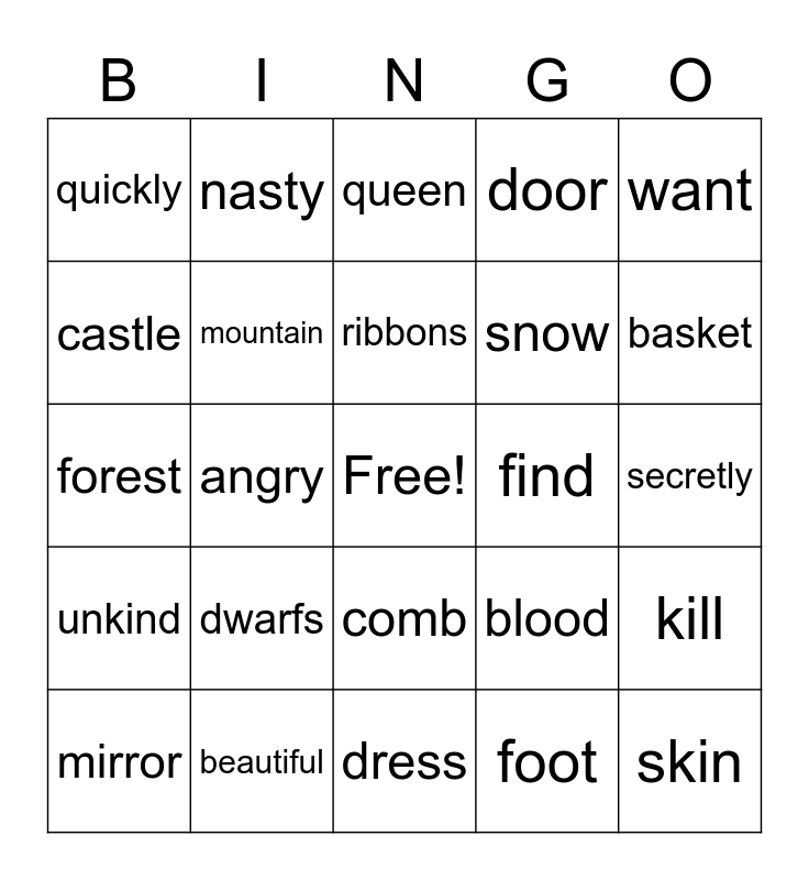 This bingo card has a free space and 27 words: blood, finger, snow, dress, castle, queen, nasty, unkind, find, kill, forest, door, mirror, beautiful, basket, little, mountain, ribbons, dwarfs, quickly, secretly, foot, angry, skin, comb, want and open.