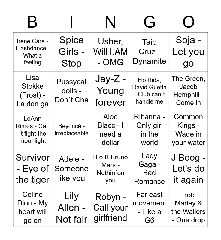 This bingo card has a free space and 24 words: Celine Dion - My heart will go on, Adele - Someone like you, Jay-Z - Young forever, Far east movement - Like a G6, Soja - Let you go, Irene Cara -Flashdance.. What a feeling, Spice Girls - Stop, Usher, Will I.AM - OMG, Rihanna - Only girl in the world, Common Kings - Wade in your water, LeAnn Rimes - Can´t fight the moonlight, Pussycat dolls - Don´t Cha, Lady Gaga - Bad Romance, J Boog - Let's do it again, Lisa Stokke (Frost) - La den gå, Lily Allen - Not fair, Robyn - Call your girlfriend, Taio Cruz - Dynamite, The Green, Jacob Hemphill - Come in, Survivor - Eye of the tiger, Beyoncé - Irreplaceable, B.o.B,Bruno Mars - Nothin´on you, Flo Rida, David Guetta - Club can´t handle me and Bob Marley & the Wailers - One drop.