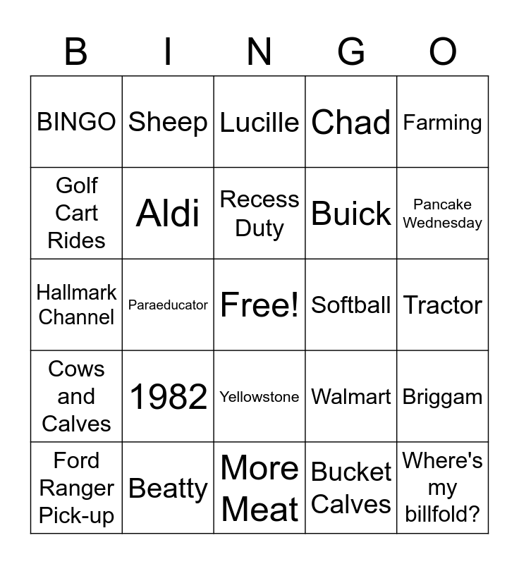 This bingo card has a free space and 91 words: Hawaii, Michelle, Yellowstone, Kwik Star, YMCA, Steak Dinner, MCC Professor, Pink and Burgundy, Floyd, Baseball, Shannon, Iowa Wrestling, Tennis, Tractor, Chicken Noodle Supper, Recess Duty, Jude, New Era, Where's my phone?, Homemade Icecream, Estella, Mulberry Rd., More Meat, Shopping, Hallmark Channel, Beatty, CATO, Wilton Beavers, KWPC Birthday & Anniversary Show, Petersen, Tim, Briggam, Peaches, Cows and Calves, BINGO, Chad, Lucille, Wilton Elementary, Paraeducator, Pancake Wednesday, Ford Ranger Pick-up, Golf Cart Rides, Spangler Chapel, Minnesota Vikings, Refinishing Projects, Walmart, Paul, Wagon, Naps, Malt-O-Meal, Soup Supper Sign, Buick, Jazzy, 152nd St, Sewing, Days of Our Lives, Softball, Cattlemen's Beef Quarters, Karen, Wheelchair, February 6th, Hogs, Muscatine Co. Fair, Bonfires, Poconos, Wisconsin Dells, Iowa State Fair, Bucket Calves, Massage, Hawkeyes, 1982, Where's my billfold?, Peach Pie, Ruby, Sheep, Aldi, Minnesota Twins, Kent Research Farm, Happy Joe's, Carl Ann, The Bachelor, Farming, Lunch Lady, Mardelle, Pizza, Texas Roadhouse, State Wrestling, Wheel of Fortune, Finnian, Tailgating and Game Show Network.
