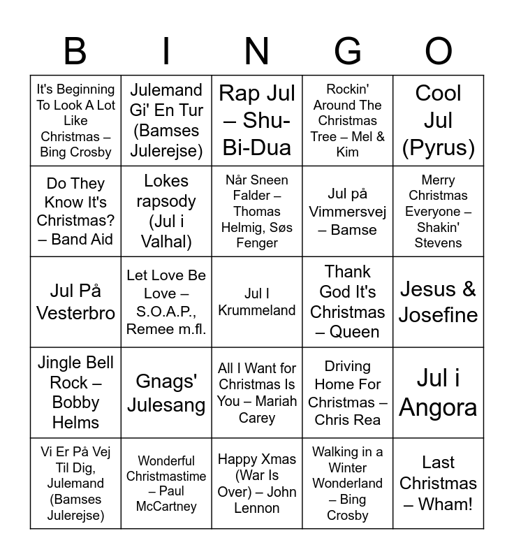 This bingo card has 35 words: Den Himmelblå – Shu-Bi-Dua, Nu Er Det Jul (Nissebanden), Vinterbyøster, Lokes rapsody (Jul i Valhal), All I Want for Christmas Is You – Mariah Carey, Rockin' Around The Christmas Tree – Mel & Kim, Do They Know It's Christmas? – Band Aid, Krystaller (Jesus & Josefine), Når Sneen Falder – Thomas Helmig, Søs Fenger, Santa Baby – Kylie Minogue, Jul På Vesterbro, Cool Jul (Pyrus), Feliz Navidad – José Feliciano, Let It Snow! Let It Snow! Let It Snow! – Dean Martin, It's Beginning To Look A Lot Like Christmas – Bing Crosby, Thank God It's Christmas – Queen, Walking in a Winter Wonderland – Bing Crosby, Let Love Be Love – S.O.A.P., Remee m.fl., Jingle Bell Rock – Bobby Helms, Jul I Krummeland, Driving Home For Christmas – Chris Rea, Vi Er På Vej Til Dig, Julemand (Bamses Julerejse), Jul i Angora, Wonderful Christmastime – Paul McCartney, Rap Jul – Shu-Bi-Dua, Merry Christmas Everyone – Shakin' Stevens, Last Christmas – Wham!, Santa Claus Is Coming To Town – The Jackson 5, Jul på Vimmersvej – Bamse, Jesus & Josefine, Det er Risengrød (Nissebanden), Happy Xmas (War Is Over) – John Lennon, Gnags' Julesang, Julemand Gi' En Tur (Bamses Julerejse) and Jul Det' Cool – Mc Einar.