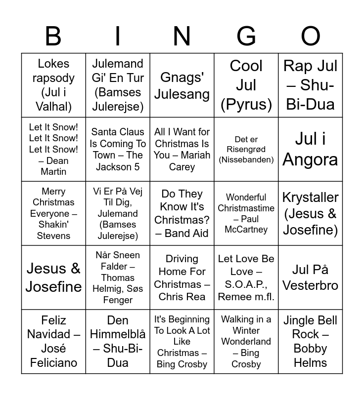 This bingo card has 36 words: Free!, Happy Xmas (War Is Over) – John Lennon, Jul I Krummeland, Santa Claus Is Coming To Town – The Jackson 5, Let Love Be Love – S.O.A.P., Remee m.fl., Jesus & Josefine, All I Want for Christmas Is You – Mariah Carey, Santa Baby – Kylie Minogue, Rap Jul – Shu-Bi-Dua, Jul Det' Cool – Mc Einar, Vi Er På Vej Til Dig, Julemand (Bamses Julerejse), Cool Jul (Pyrus), Jul på Vimmersvej – Bamse, Wonderful Christmastime – Paul McCartney, Jul i Angora, Lokes rapsody (Jul i Valhal), Jingle Bell Rock – Bobby Helms, Når Sneen Falder – Thomas Helmig, Søs Fenger, Do They Know It's Christmas? – Band Aid, Gnags' Julesang, Krystaller (Jesus & Josefine), Jul På Vesterbro, Den Himmelblå – Shu-Bi-Dua, Feliz Navidad – José Feliciano, It's Beginning To Look A Lot Like Christmas – Bing Crosby, Julemand Gi' En Tur (Bamses Julerejse), Merry Christmas Everyone – Shakin' Stevens, Rockin' Around The Christmas Tree – Mel & Kim, Det er Risengrød (Nissebanden), Let It Snow! Let It Snow! Let It Snow! – Dean Martin, Vinterbyøster, Nu Er Det Jul (Nissebanden), Walking in a Winter Wonderland – Bing Crosby, Driving Home For Christmas – Chris Rea, Last Christmas – Wham! and Thank God It's Christmas – Queen.