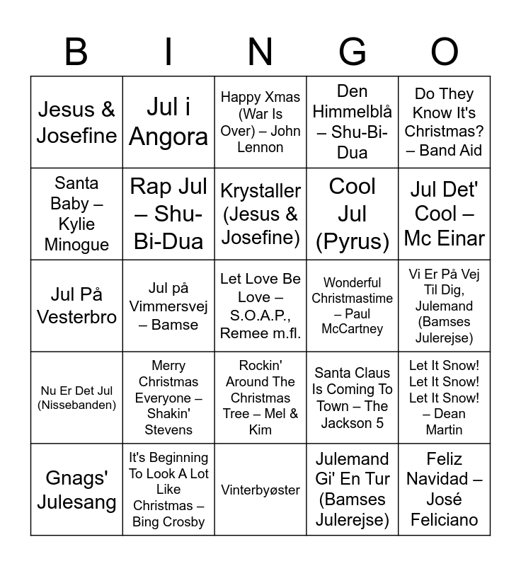 This bingo card has 35 words: Walking in a Winter Wonderland – Bing Crosby, Last Christmas – Wham!, Thank God It's Christmas – Queen, Rap Jul – Shu-Bi-Dua, Rockin' Around The Christmas Tree – Mel & Kim, Den Himmelblå – Shu-Bi-Dua, Santa Baby – Kylie Minogue, Jingle Bell Rock – Bobby Helms, Krystaller (Jesus & Josefine), Det er Risengrød (Nissebanden), Jul På Vesterbro, Do They Know It's Christmas? – Band Aid, All I Want for Christmas Is You – Mariah Carey, Jul I Krummeland, Jesus & Josefine, Wonderful Christmastime – Paul McCartney, Julemand Gi' En Tur (Bamses Julerejse), Jul på Vimmersvej – Bamse, Nu Er Det Jul (Nissebanden), Let Love Be Love – S.O.A.P., Remee m.fl., Santa Claus Is Coming To Town – The Jackson 5, Gnags' Julesang, Let It Snow! Let It Snow! Let It Snow! – Dean Martin, It's Beginning To Look A Lot Like Christmas – Bing Crosby, Happy Xmas (War Is Over) – John Lennon, Jul Det' Cool – Mc Einar, Feliz Navidad – José Feliciano, Når Sneen Falder – Thomas Helmig, Søs Fenger, Cool Jul (Pyrus), Vi Er På Vej Til Dig, Julemand (Bamses Julerejse), Driving Home For Christmas – Chris Rea, Vinterbyøster, Merry Christmas Everyone – Shakin' Stevens, Jul i Angora and Lokes rapsody (Jul i Valhal).