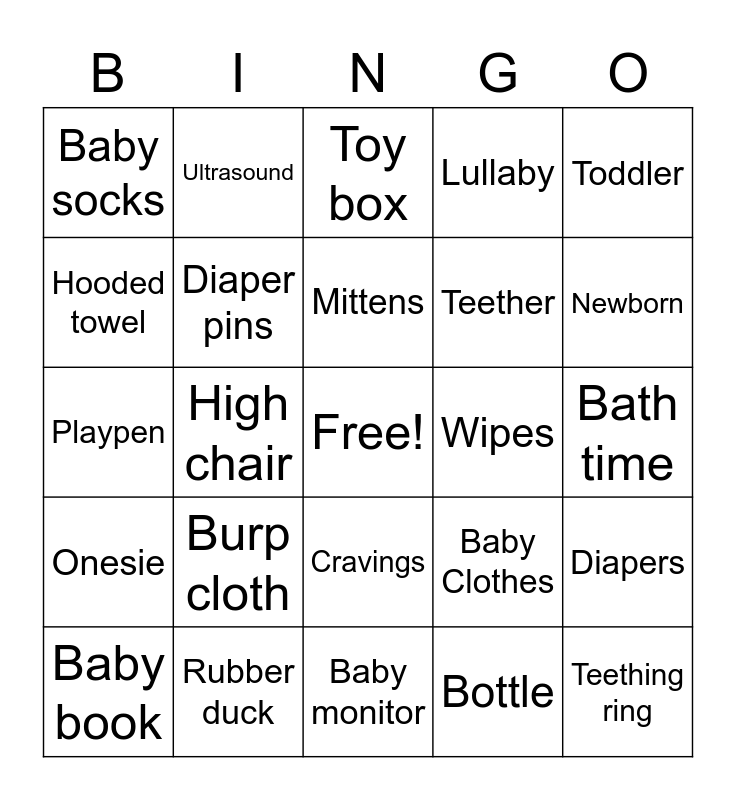 This bingo card has a free space and 63 words: Sippy cup, Baby walker, Love, Diapers, Baby shampoo, Wash cloth, Ultrasound, Baby carrier, Mittens, Nursery rhyme, Cravings, Nursery, Bath time, Toddler, Booties, Hooded towel, High chair, Baby socks, Pacifier, Teether, Burp cloth, Onesie, Lullaby, Crying, Mobiles, Security blanket, Cradle, Gifts, Milk, Baby, Diaper bag, Formula, Towel, Mommy, Newborn, Baby book, Play gym, Bottle, Rattle, Diaper pins, Playpen, Wipes, Bib, Nap time, Teething ring, Rubber duck, Baby sling, Baby Clothes, Baby food, Giggles, Support System, Baby monitor, Baby lotion, Blanket sleeper, Baby swing, Toy box, Bassinet, Baby bathtub, Stroller, Teddy bear, Bouncy seat, Baby hat and Blankets.