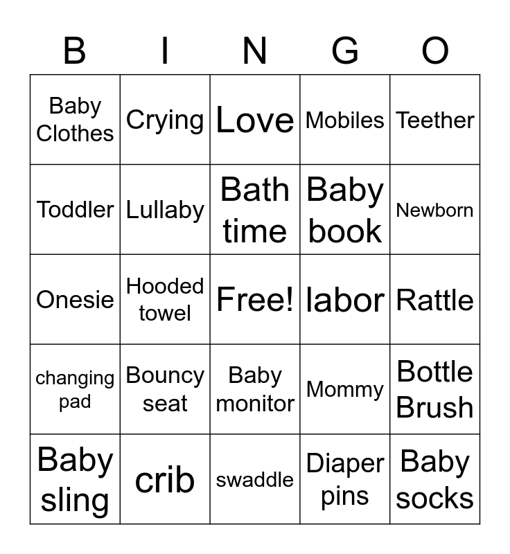 This bingo card has a free space and 75 words: Sippy cup, Baby walker, Love, Diapers, Baby shampoo, Wash cloth, Ultrasound, Baby carrier, Mittens, Nursery rhyme, Cravings, Nursery, Bath time, Toddler, Booties, Hooded towel, High chair, Baby socks, Pacifier, Teether, Burp cloth, Onesie, Lullaby, Crying, Mobiles, Security blanket, Cradle, Gifts, Milk, Baby, Diaper bag, Formula, Towel, Mommy, Newborn, Baby book, Play gym, Bottle, Rattle, Diaper pins, Playpen, Wipes, Bib, Nap time, Teething ring, Rubber duck, Baby sling, Baby Clothes, Baby food, Giggles, Support System, Baby monitor, Baby lotion, Blanket sleeper, Baby swing, Toy box, Bassinet, Baby bathtub, Stroller, Teddy bear, Bouncy seat, Baby hat, Blankets, Breast pump, due date, labor, Bottle Warmer, Babble, crawl, Bottle Brush, changing pad, crib, tummy time, swaddle and receiving blankets.