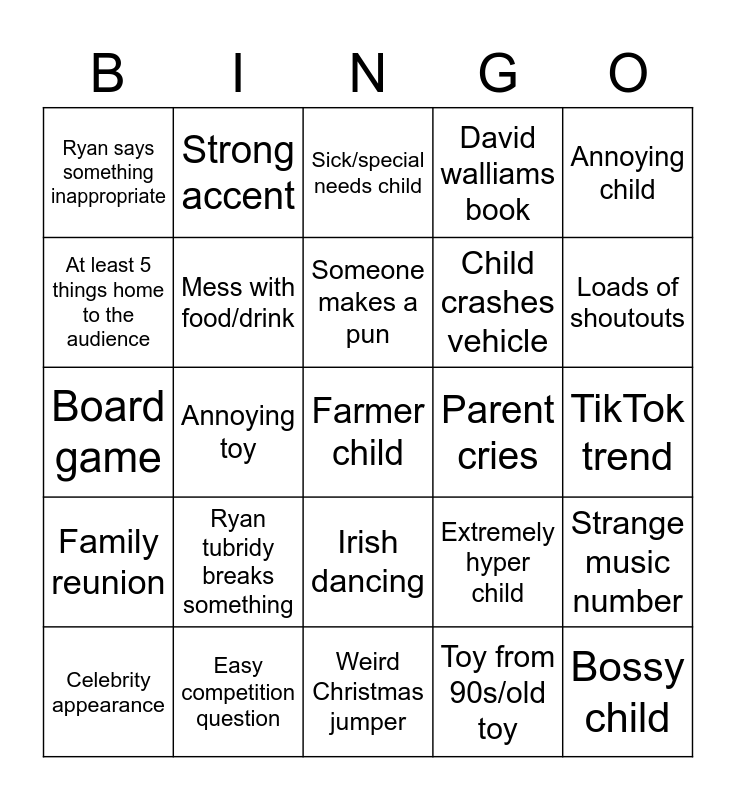 This bingo card has 25 words: Ryan tubridy breaks something, Weird Christmas jumper, Someone makes a pun, Celebrity appearance, Annoying child, Ryan says something inappropriate, At least 5 things home to the audience, Strong accent, Parent cries, Irish dancing, Child crashes vehicle, Board game, Extremely hyper child, Strange music number, Mess with food/drink, Bossy child, TikTok trend, Sick/special needs child, Loads of shoutouts, Annoying toy, Farmer child, Easy competition question, Family reunion, David walliams book and Toy from 90s/old toy.