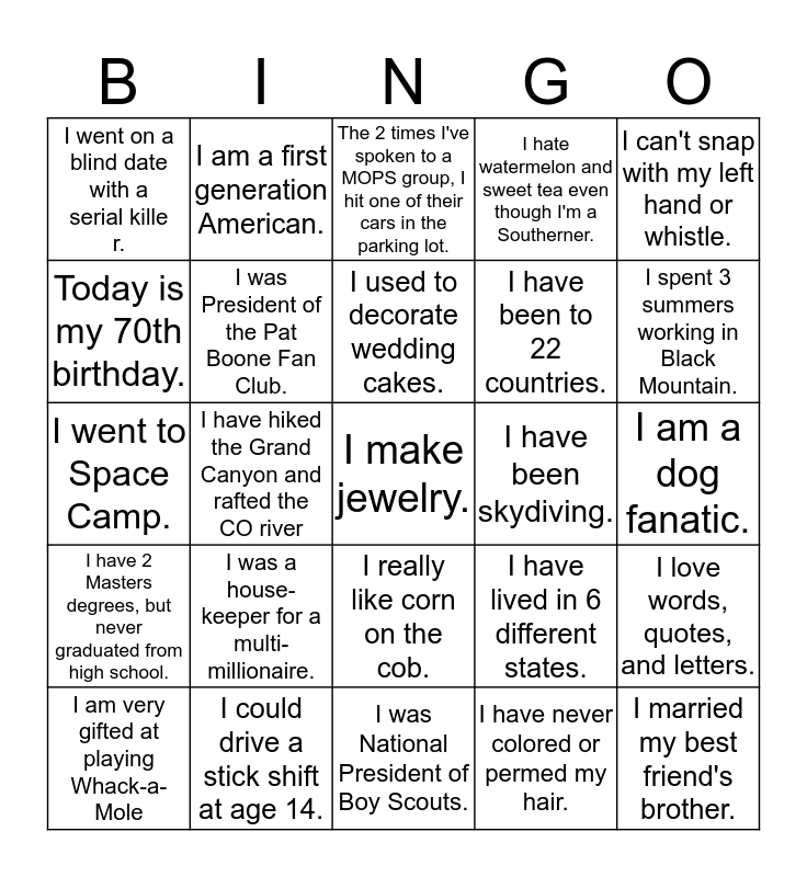 This bingo card has 29 words: I am very gifted at playing Whack-a-Mole, I love the beach, I have hiked the Grand Canyon and rafted the CO river, I married my best friend's brother., I went on a blind date with a serial killer., The 2 times I've spoken to a MOPS group, I hit one of their cars in the parking lot., I was President of the Pat Boone Fan Club., I was a house-keeper for a multi-millionaire., I have been skydiving., I could drive a stick shift at age 14., I am a dog fanatic., I make jewelry., I was National President of Boy Scouts., I have never colored or permed my hair., I spent 3 summers working in Black Mountain., I was a West Forsyth Titanide., I really like corn on the cob., I have 2 Masters degrees, but never graduated from high school., I can't snap with my left hand or whistle., I went to Space Camp., I have lived in 6 different states., I was a competitive swimmer., I have been to 22 countries., Today is my 70th birthday., I hate watermelon and sweet tea even though I'm a Southerner., I am a first generation American., I love words, quotes, and letters., I used to decorate wedding cakes. and I ran my first marathon at age 51..