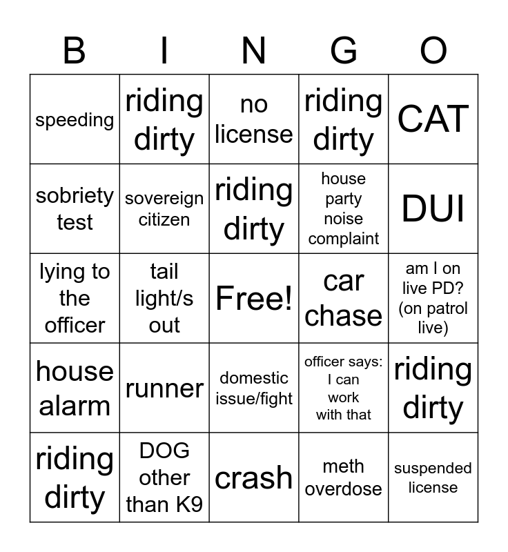 This bingo card has a free space and 29 words: riding dirty, these aren't my pants, tail light/s out, I only had one beer, speeding, no license, sovereign citizen, runner, car chase, DOG other than K9, am I on live PD? (on patrol live), suspended license, crash, meth overdose, DUI, warrant for arrest, domestic issue/fight, house alarm, CAT, lying to the officer, officer says: I can work with that, marijuana in car, house party noise complaint, sobriety test, riding dirty, riding dirty, riding dirty, riding dirty and riding dirty.