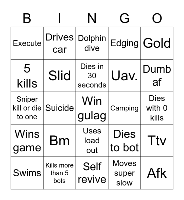 This bingo card has a free space and 24 words: Bm, Kills more than 5 bots, Dies in 30 seconds, Swims, Gold, Execute, 5 kills, Drives car, Camping, Uses load out, Uav., Sniper kill or die to one, Dies to bot, Ttv, Slid, Moves super slow, Dies with 0 kills, Dolphin dive, Dumb af, Suicide, Afk, Wins game, Edging and Self revive.