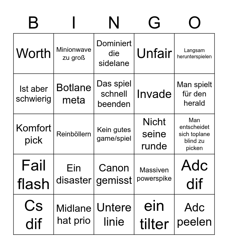 This bingo card has 56 words: Free!, Cs dif, Sneaky, Worth, Untere linie, Camp bot, Botlane meta, Broken, Invade, Steal, Unfair, Einfach besser, Cleaner dive, Erstes blut, Mastery 7, Ff, Langsam herunterspielen, Reinböllern, Runterfahren, Kein gutes game/spiel, Nicht seine runde, Was sehen wir hier, Massiven powerspike, Dominiert die sidelane, Sie kommen über das lategame, Das spiel schnell beenden, Was eine partie, Wissen garnicht was sie machen sollen, Man spielt für den herald, Man spielt für den drachen, Die soul ist die wincon, Kein gutes matchup, Sehr gutes matchup, Man hat den counterpick auf toplane, Man entscheidet sich toplane blind zu picken, Ist aber schwierig, Komfort pick, Wahnsinniges outplay, Fail flash, Minionwave zu groß, Canon gemisst, Adc peelen, Türme einreißen, 10k gold lead, Nicht mehr verlierbar, Ein disaster, Midlane hat prio, Da muss er aufpassen, So kann das nicht weitergehen, für catches spielen, ein tilter, Mid diff, Top dif, Jgl/jungle dif, Adc dif and Supp/support dif.
