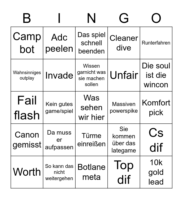 This bingo card has 56 words: Free!, Worth, Untere linie, Camp bot, Botlane meta, Broken, Invade, Steal, Unfair, Einfach besser, Cleaner dive, Erstes blut, Mastery 7, Ff, Langsam herunterspielen, Reinböllern, Runterfahren, Kein gutes game/spiel, Nicht seine runde, Was sehen wir hier, Massiven powerspike, Dominiert die sidelane, Sie kommen über das lategame, Das spiel schnell beenden, Was eine partie, Wissen garnicht was sie machen sollen, Man spielt für den herald, Man spielt für den drachen, Die soul ist die wincon, Kein gutes matchup, Sehr gutes matchup, Man hat den counterpick auf toplane, Man entscheidet sich toplane blind zu picken, Ist aber schwierig, Komfort pick, Wahnsinniges outplay, Fail flash, Minionwave zu groß, Canon gemisst, Adc peelen, Türme einreißen, 10k gold lead, Nicht mehr verlierbar, Ein disaster, Midlane hat prio, Da muss er aufpassen, So kann das nicht weitergehen, für catches spielen, ein tilter, Mid diff, Top dif, Jgl/jungle dif, Adc dif, Supp/support dif, Cs dif and Sneaky.