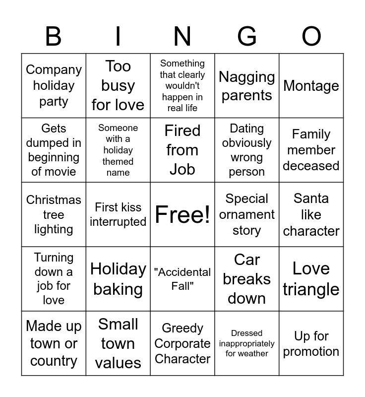 This bingo card has a free space and 83 words: Town Christmas Festival, Awkward Proposal, Something that clearly wouldn't happen in real life, Anti-Christmas character, Horse drawn carriage or sleigh ride, Workaholic, Ice Skating, Impromptu snowball fight, Christmas PJs, Single Parent, Main characters "bump into" each other in the beginning, Trying to come clean and gets interupted, Someone with a holiday themed name, Special ornament story, Ridiculously convenient mistletoe, Company holiday party, Made up town or country, Gets dumped in beginning of movie, Terribly bad fake CGI snow, Someone spending holiday in the tropics, Family property or business in trouble, Dating obviously wrong person, Up for promotion, Christmas Caroling, First kiss interrupted, Ugly sweater, Childhood sweethearts, From a small town, Secretly royal, Sneaking around, Holiday baking, Cookie Decorating, Christmas tree decorating, Christmas tree lighting, Elderly advice, Lives in place they clearly can't afford, Greedy Corporate Character, Christmas tree shopping, Family member deceased, Turning down a job for love, Children's christmas play or pageant, "My hands are tied" or "It's out of my hands", Gift Wrapping, "I have to take this", Coworker is best friend, Unintentional hand holding, Too busy for love, Excessively decorated interior, Putting star or angel on top of christmas tree, Cheesy line that makes you roll your eyes, Car breaks down, Nagging parents, Santa like character, Property as a gift, Crazy Snowstorm that shuts down travel, Drinking hot chocolate, Drinking egg nog, Jumping to conclusions, Small town values, Small town has impressive diversity, Nativity Scene, Cute animal, Handsome single father, Montage, Musical number, Love triangle, Charity or helping homeless, Reindeer, Prince or Princess, Stockings, Poinsetta, Countdown to christmas overlay during movie, Stalking, "Accidental Fall", Dressed inappropriately for weather, Pointlessly shirtless man, Building a snowman, Fired from Job, Town with Christmas themed name, Obvious product placement, Obscure 90's actor, Netflix christmas movie crossover and New York or Chicago.