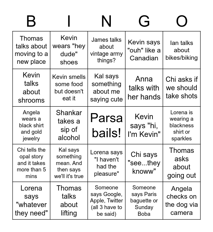 This bingo card has a free space and 24 words: Kal says something mean. And then says we'll it's true, Thomas talks about lifting, Kal says something about me saying cute, Lorena says "whatever they need", Ian talks about bikes/biking, Thomas talks about moving to a new place, Kevin talks about shrooms, Kevin wears "hey dude" shoes, Kevin says "hi, I'm Kevin", Lorena says "I haven't had the pleasure", Anna talks with her hands, Angela wears a black shirt and gold jewelry, Chi says "see...they knoww", Thomas asks about going out, Kevin smells some food but doesn't eat it, Someone says Paris baguette or Sunday Boba, Lorena is wearing a blackness shirt or sparkles, James talks about vintage army things?, Chi asks if we should take shots, Shankar takes a sip of alcohol, Angela checks on the dog via camera, Chi tells the opal story and it takes more than 5 mins, Kevin says "ouh" like a Canadian and Someone says Google, Apple, Twitter (all 3 have to be said).