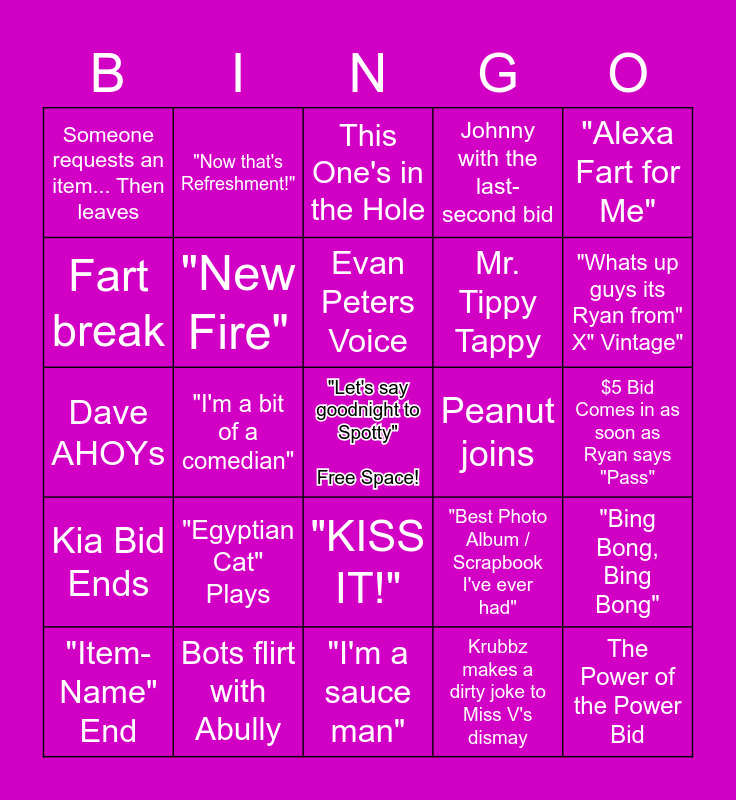 This bingo card has a free space and 24 words: "Egyptian Cat" Plays, Bots flirt with Abully, Evan Peters Voice, "Item-Name" End, "Alexa Fart for Me", Someone requests an item... Then leaves, Fart break, "Now that's Refreshment!", Peanut joins, "KISS IT!", Mr. Tippy Tappy, Dave AHOYs, "Best Photo Album / Scrapbook I've ever had", "Bing Bong, Bing Bong", "New Fire", Krubbz makes a dirty joke to Miss V's dismay, $5 Bid Comes in as soon as Ryan says "Pass", This One's in the Hole, "Whats up guys its Ryan from" X" Vintage", "I'm a bit of a comedian", The Power of the Power Bid, Kia Bid Ends, Johnny with the last-second bid and "I'm a sauce man".