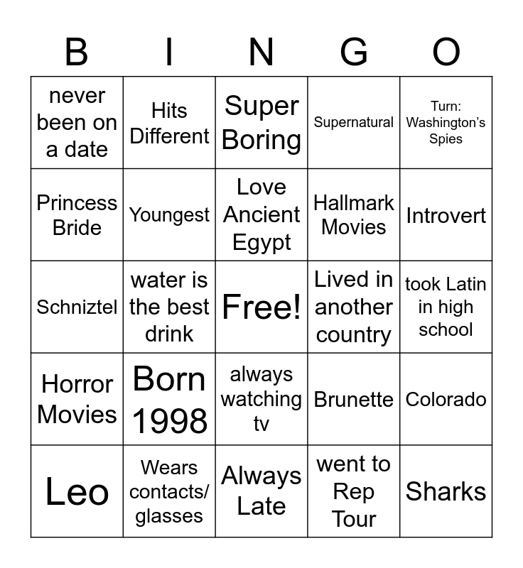 This bingo card has a free space and 24 words: Born 1998, Wears contacts/ glasses, Love Ancient Egypt, Leo, Turn: Washington’s Spies, never been on a date, Princess Bride, Hits Different, Lived in another country, always watching tv, Hallmark Movies, Schniztel, Brunette, Colorado, Youngest, went to Rep Tour, took Latin in high school, Super Boring, Introvert, water is the best drink, Sharks, Horror Movies, Supernatural and Always Late.