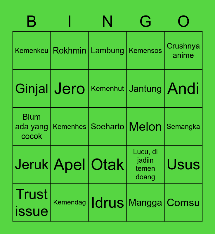 This bingo card has 25 words: Apel, Idrus, Kemenhut, Trust issue, Crushnya anime, Kemenkeu, Ginjal, Rokhmin, Melon, Otak, Jantung, Blum ada yang cocok, Lucu, di jadiin temen doang, Usus, Jero, Comsu, Semangka, Lambung, Andi, Kemenhes, Soeharto, Kemendag, Jeruk, Kemensos and Mangga.