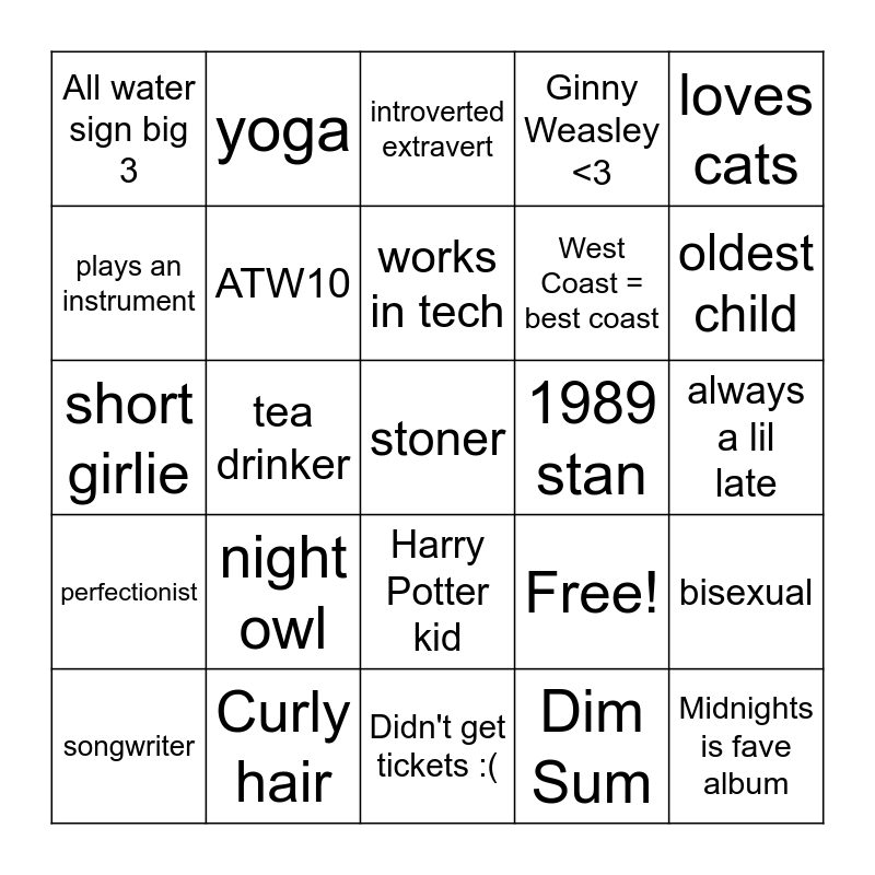 This bingo card has 25 words: night owl, Didn't get tickets :(, works in tech, songwriter, loves cats, All water sign big 3, plays an instrument, yoga, 1989 stan, Harry Potter kid, West Coast = best coast, short girlie, Free!, bisexual, ATW10, Midnights is fave album, always a lil late, introverted extravert, oldest child, tea drinker, stoner, Curly hair, perfectionist, Ginny Weasley <3 and Dim Sum.